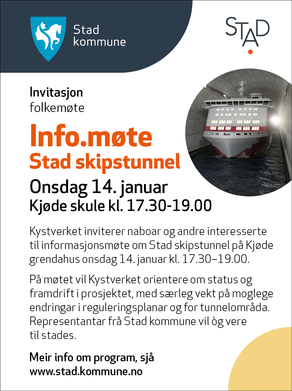Infomøte Stad skipstunnel 14. januarKystverket inviterer naboar og andre interesserte til informasjonsmøte om Stad skipstunnel på Kjøde grendahus onsdag 14. januar kl. 17.30–19.00.På møtet ønskjer Kystverket å orientere om status og framdrift i prosjektet, med særleg vekt på moglege endringar i reguleringsplanar og for tunnelområda. Stad kommune vil òg vere til stades.Stad skipstunnel Publisert 12.01.2026 15.17 Sist endra 13.01.2026 08.51