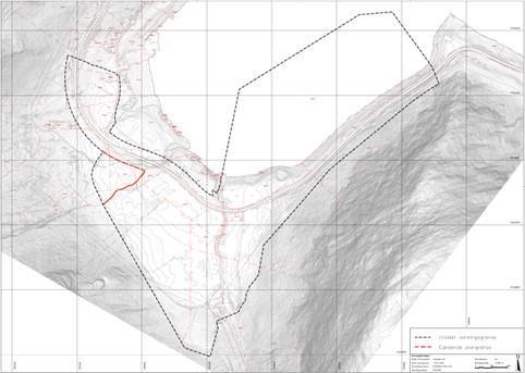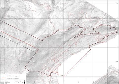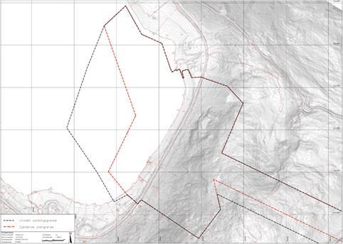 Figuren over viser omriss av gjeldande reguleringsplan med raud stipla linje, og forslag til ny, utvida plangrense er vist med svart farge. Ny planavgrensing viser noko utviding i vest, men er elles same som for gjeldande reguleringsplan for Kjøde næringspark.Varslingsgrense Kjøde (PDF, 2 MB)