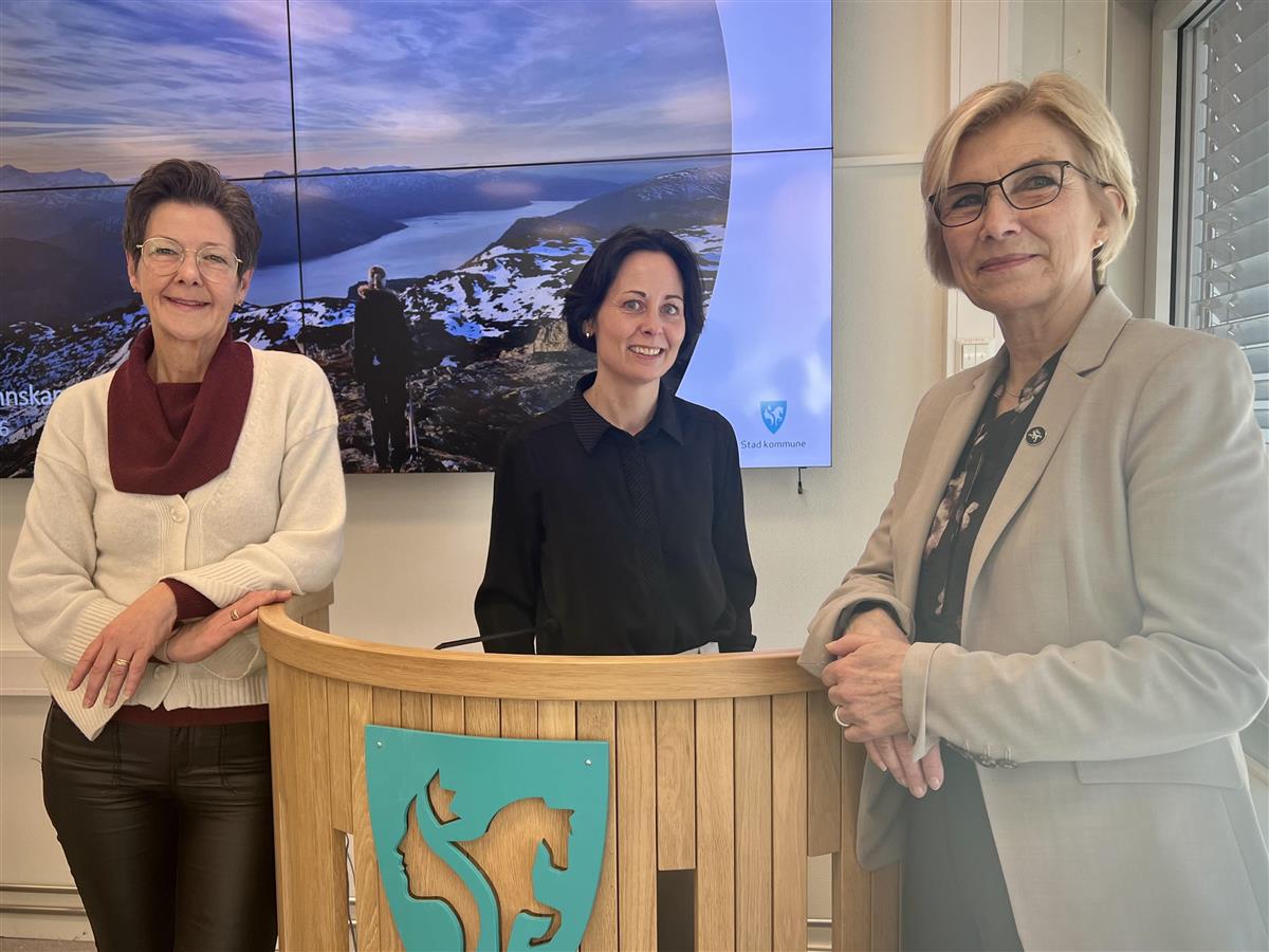 Ordførar Judit Kvåle, kommunedirektør Kristine Dahl saman med Marit Lunde frå Statsforvaltaren i Vestland.